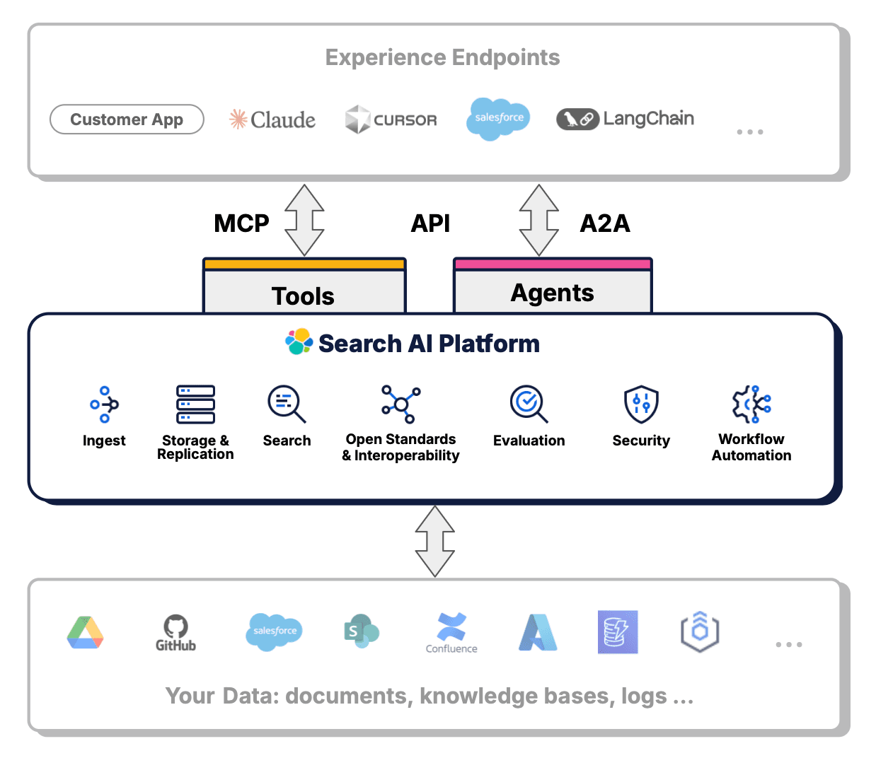 Delivering AI Experiences: this is the ultimate goal. With our Search AI Platform and your data as a foundation, you can build any type of generative AI application: from custom chat interfaces to integrations with agentic frameworks like LangChain or business applications like Salesforce.
