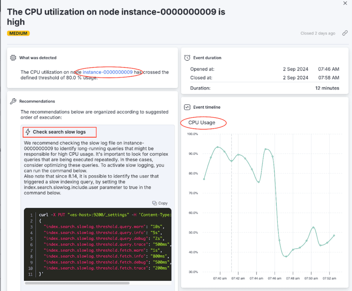 Easy Troubleshooting: Troubleshooting can be complex, especially in larger environments. AutoOps performs root cause analysis and provides drill-downs to the exact point in time when an issue occured, and resolution paths including in-context Elasticsearch commands and best practices.