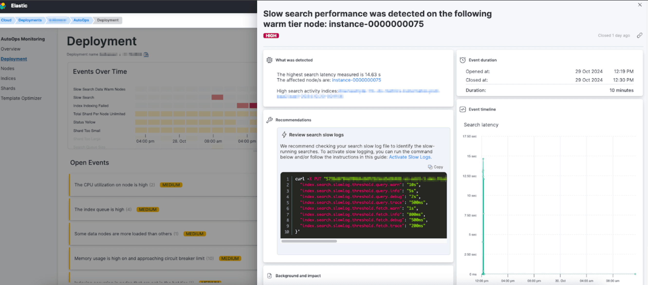 AutoOps Slow search performance event - detects slow search performance on the loaded node