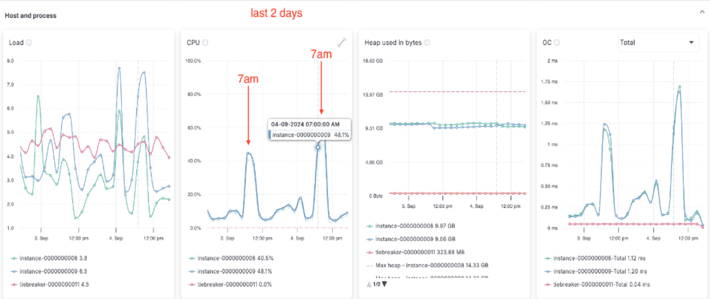 AutoOps identifies the time window during which CPU utilization was high, and provides a drill-down into the point of time of the issue with a recommendation to check slow logs. Drilling down further into the node view reveals that the CPU is high every day, at about 7am.