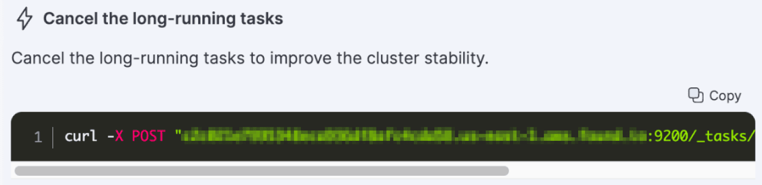 AutoOps provides in-context Elasticsearch commands to resolve the issues, such as canceling the long running search task