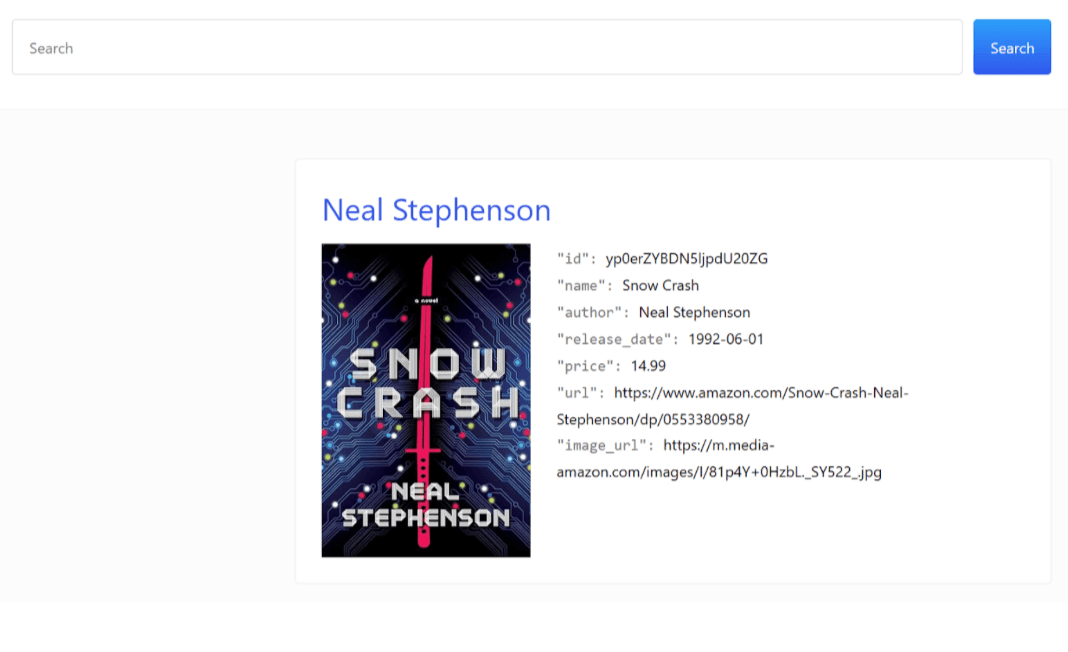 Next, change search_fields and result_fields to align with the dataset. We are going to search through the book's name and author and return the name, author, image_url, url, and price.