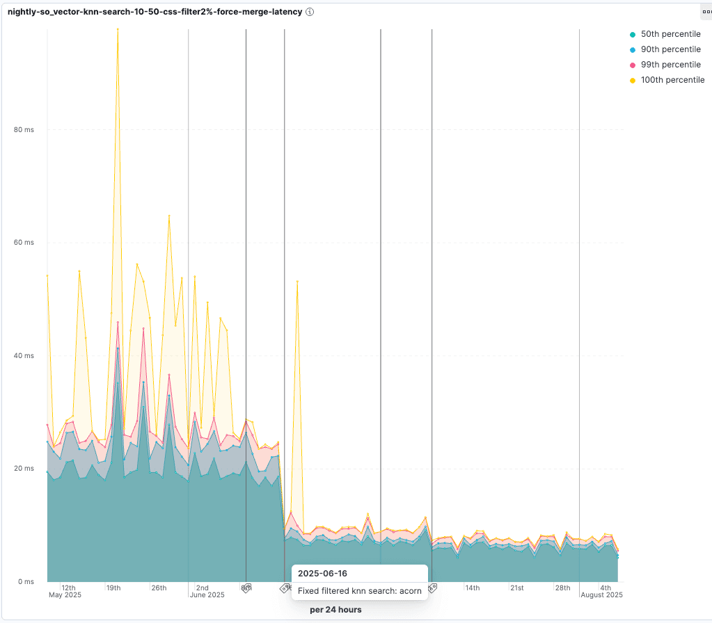 At Elasticsearch, we want to make sure that vector search filtering is efficient. We have a specific benchmark for vector filtering that performs approximate vector searches with different filtering to ensure that vector search keeps retrieving relevant results as fast as possible.