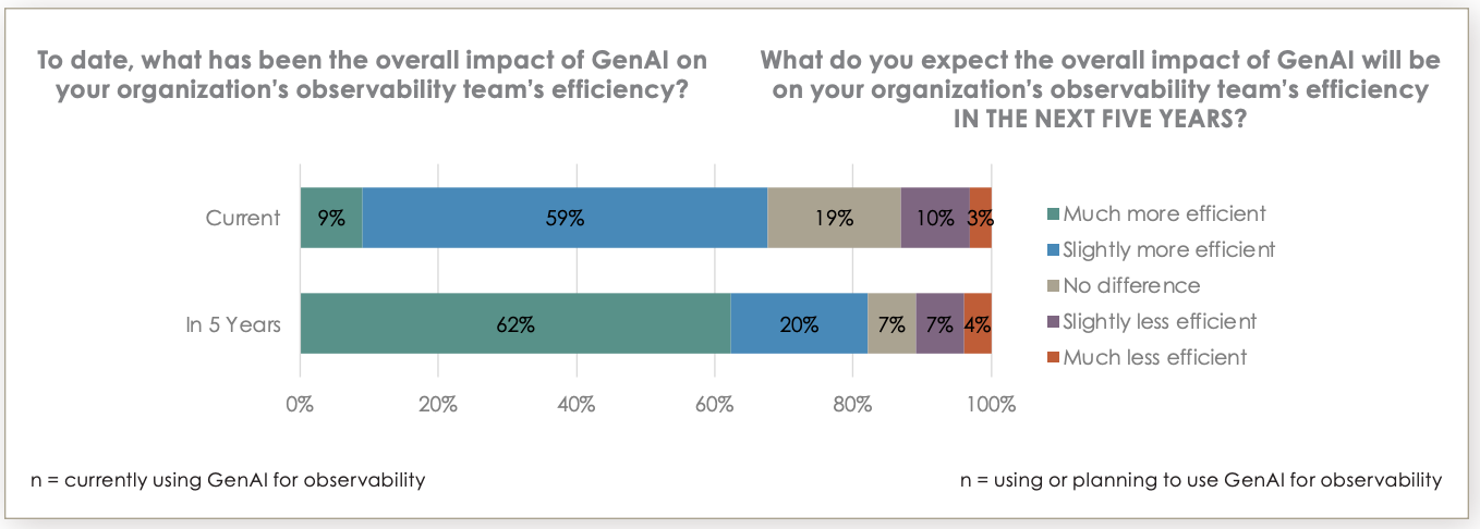 The impact of this technology is already tangible. Currently, 68% of teams report that GenAI has improved their operational efficiency, and expectations are set to surge with 82% anticipating significant efficiency gains within five years. The most common use cases driving these improvements include remediation and automated operations, automated correlation, and root cause analysis.