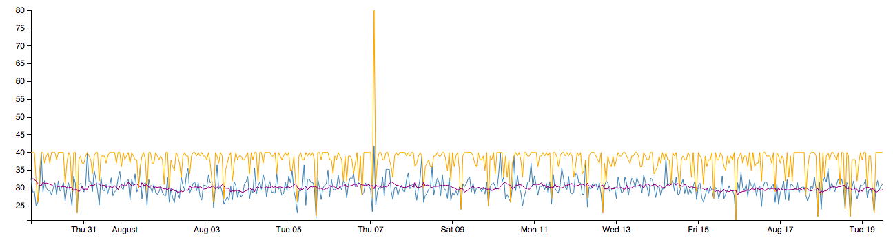If we plot the maximum value in each bucket (yellow line) the spike is immediately clear: