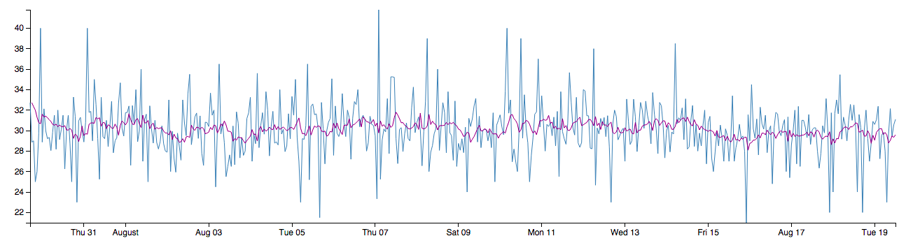 As you can see, the data is basically a flat trend, with a random distribution around ~30. The data is noisy, so the first thing you might like to do is smooth it out so you can see the general trend better. Moving averages are great for this.