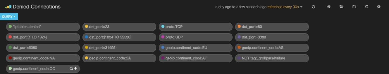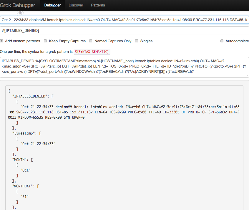 You can see that some definitions are based on already existing patterns - for e.g. IPTABLES_DENIED reuses Grok patterns SYSLOGTIMESTAMP, HOSTNAME and IP. This is one of the key strengths of Grok, aimed at making a better use of your time, other than writing and re-writing regex after regex.
