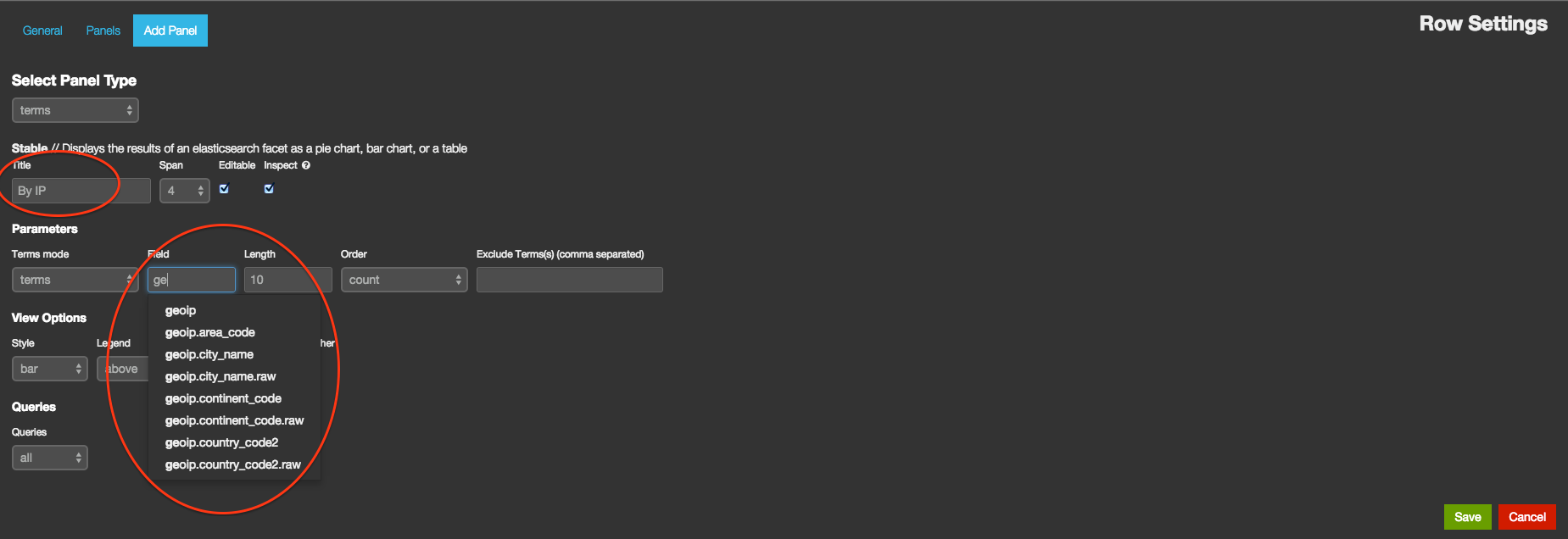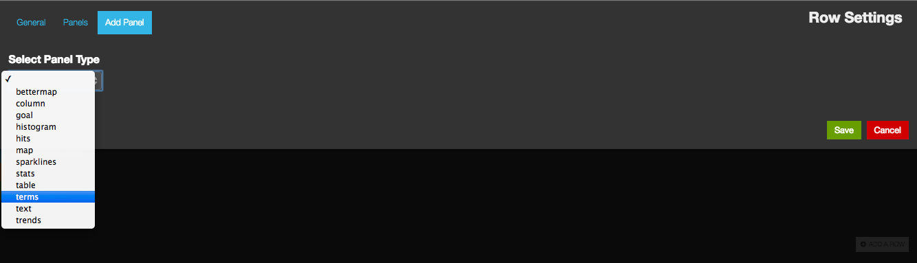 Finally let's add our first panel and choose panel type 'Terms' to show some nice aggregations