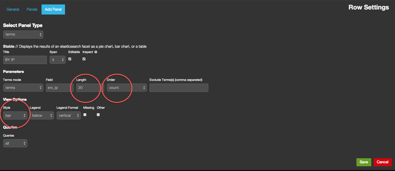 We choose now 'src_ip' for this panel and let's set up some more options, we want to see the top 20 IPs, sorted by count, using bars as the visualization format.