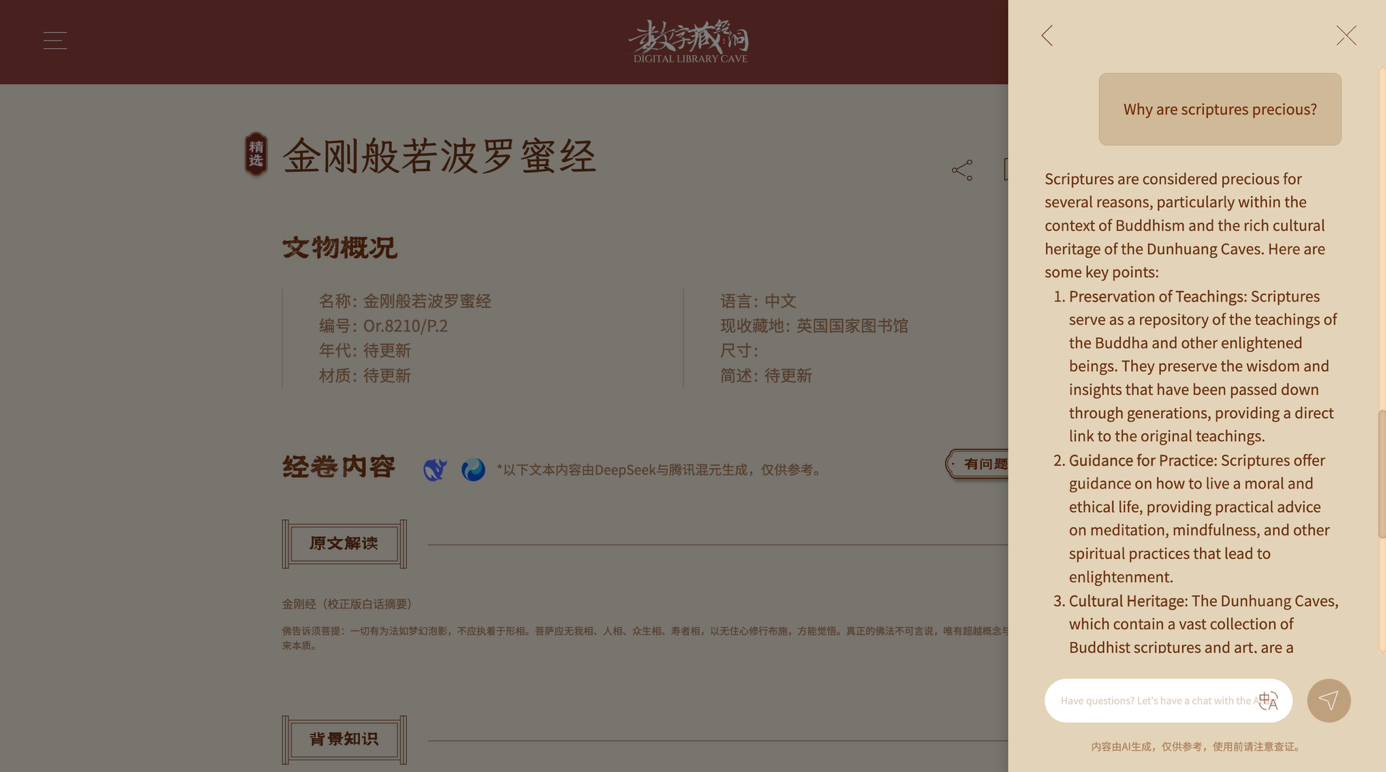 比如,藏经洞是哪年发现的?金刚经有多少字?无论你提出什么问题,都能秒级响应,给出答案。经过敦煌专家团的测试,回答准确率高达95%。