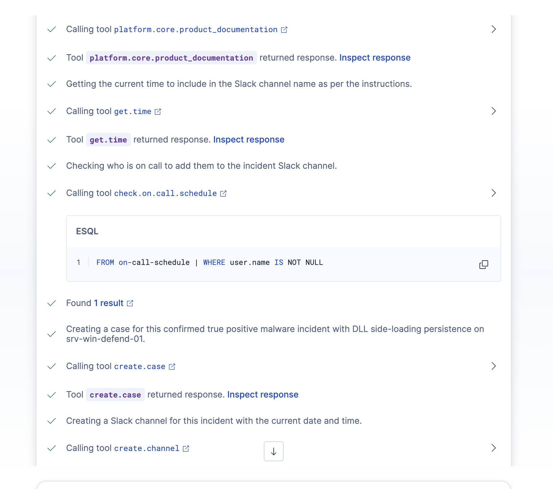 - Agenten denken nach, Arbeitsabläufe werden ausgeführt – der Agent hat selbstständig entschieden, VirusTotal aufzurufen, Protokolle zu durchsuchen, den Bereitschaftsplan zu überprüfen und einen Slack-Kanal zu erstellen. Diese Abfolge wurde von keinem Menschen entworfen.