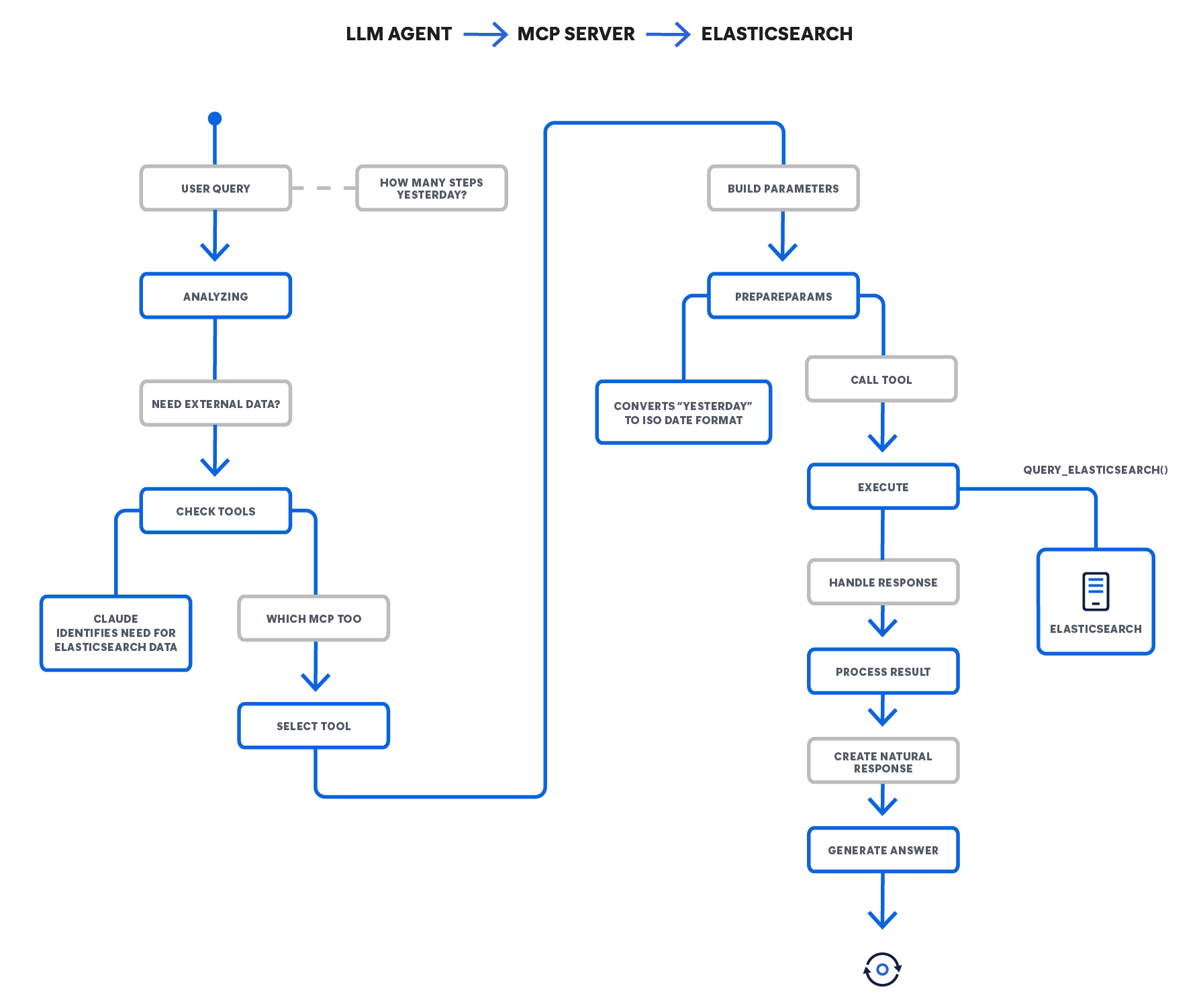 Tools interagieren mit Servern auf folgende Weise: Ein MCP-Server deklariert die Tools, die er anbietet. Beispielsweise würde ein Elastic-Server ein „list_indices“-Tool bereitstellen und dessen Namen, Zweck und erforderliche Parameter (z. B. „list_indices“, „get_mappings“, „get_shards“ und „suchen“) definieren.