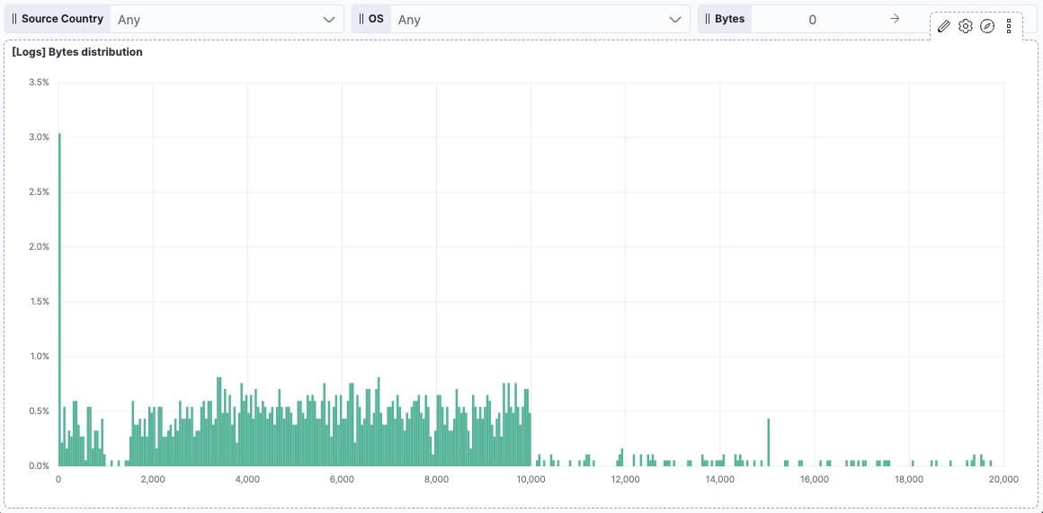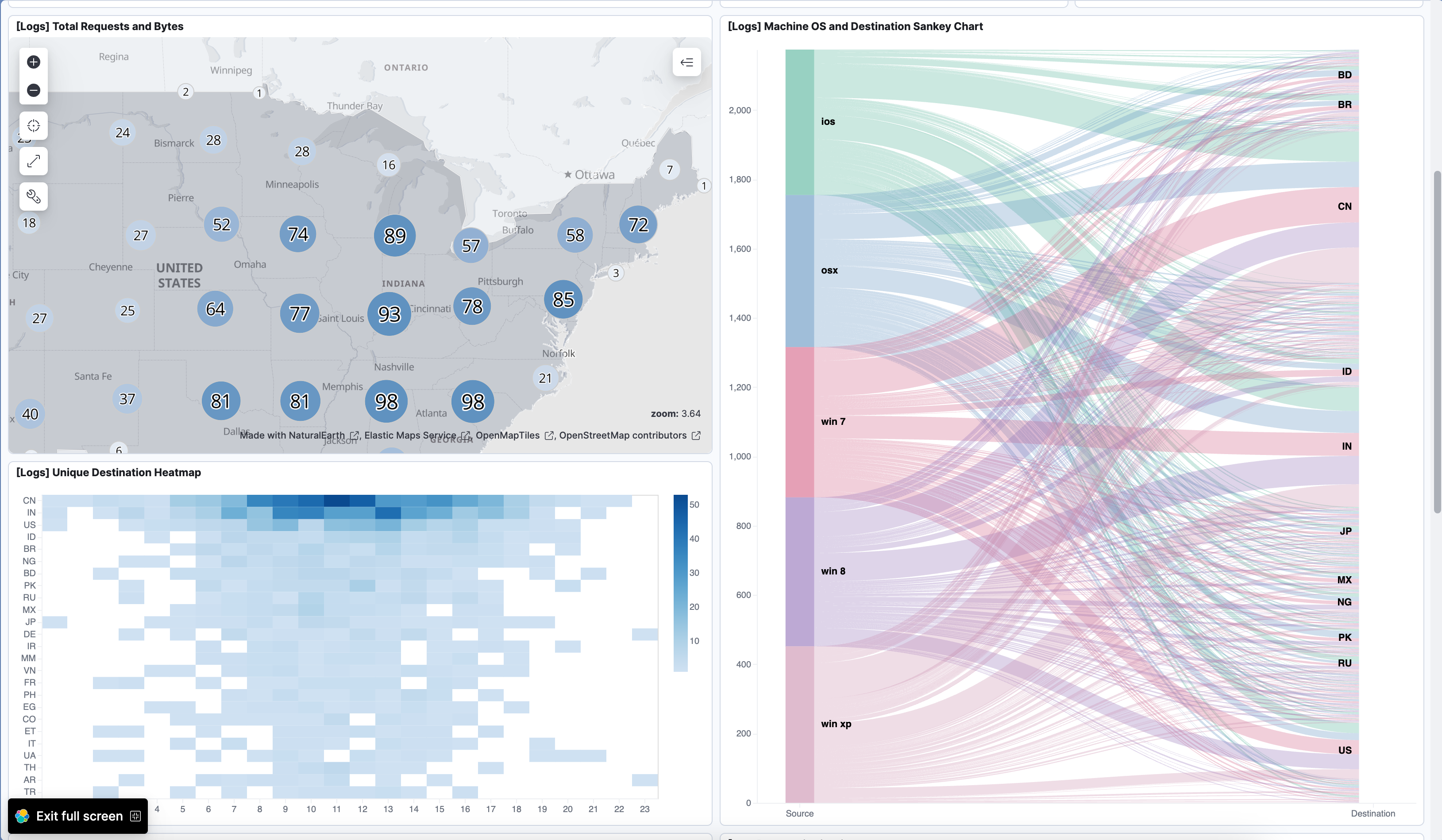 Kibana dashboards support filtering, time range adjustments, and interactive controls that let you focus on specific data segments or time periods. Use these interactive features to drill into your data, compare metrics across different dimensions, and uncover insights that matter to your analysis.