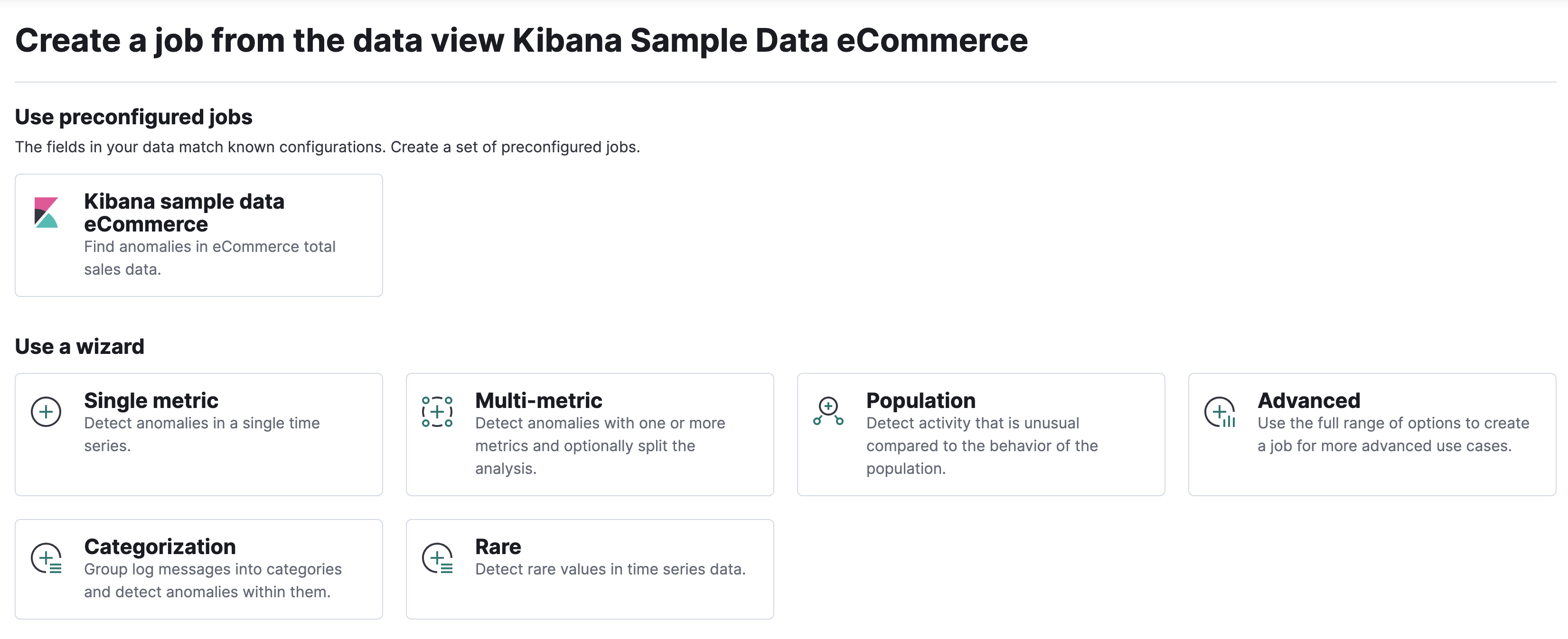 Kibana can also recognize certain types of data and provide specialized wizards for that context. For example, there are anomaly detection jobs for the sample eCommerce orders and sample web logs data sets, as well as for data generated by the Elastic Security and Observability solutions, Beats, and Elastic Agent Integrations. For a list of all the preconfigured jobs, see Supplied configurations.