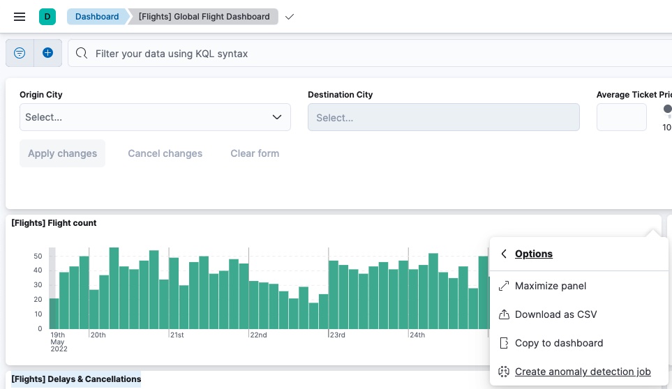 You need to have a compatible visualization on Dashboard to create an anomaly detection job. If you don’t have one but you want to try the feature out, go to Analytics > Dashboard and select the [Flight] Global Flight Dashboard which is based on the Kibana sample flight data set. Select the Flight count visualization from the dashboard.