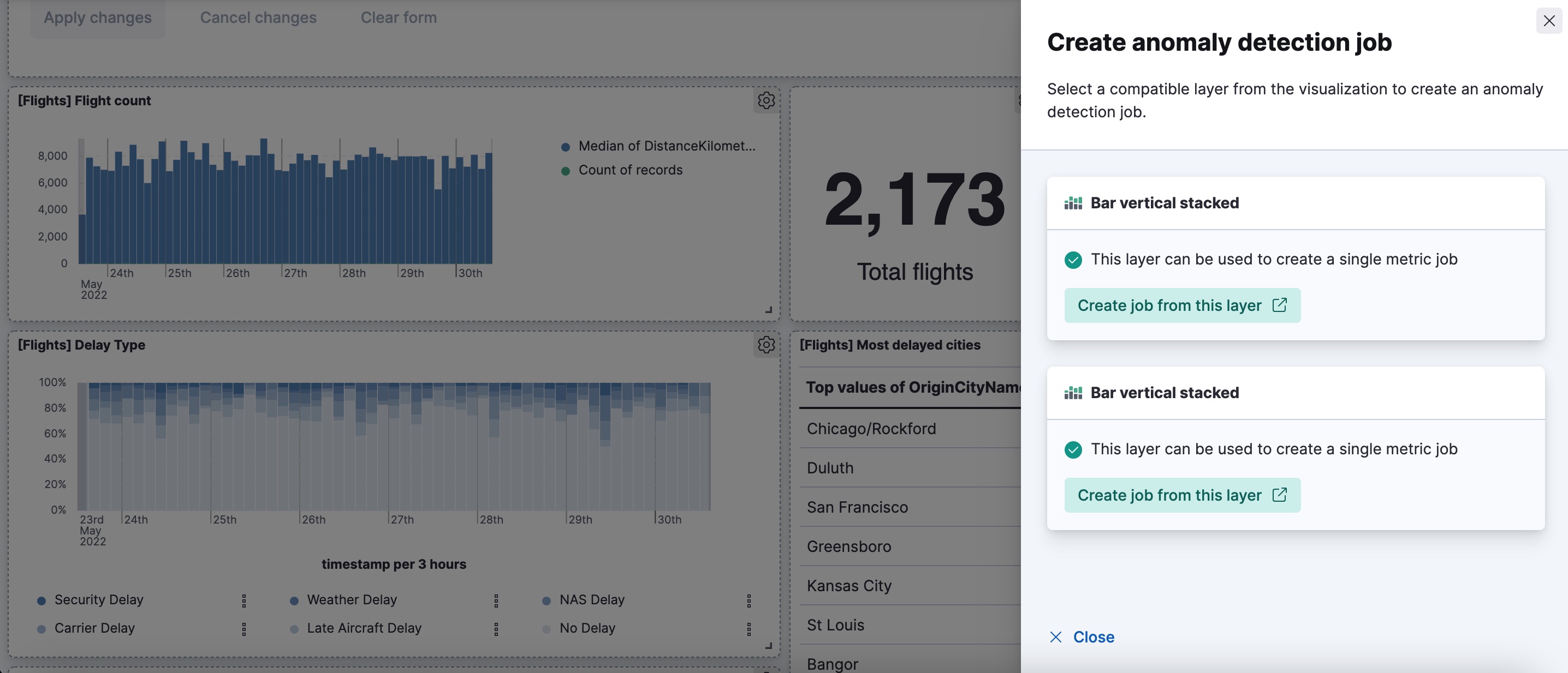 If the visualization has multiple compatible layers, you can select which layer to use for creating the anomaly detection job.