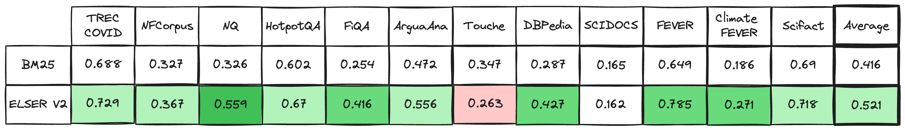 The table below shows the performance of ELSER V2 compared to BM 25. ELSER V2 has 10 wins, 1 draw, 1 loss and an average improvement in NDCG@10 of 18%.