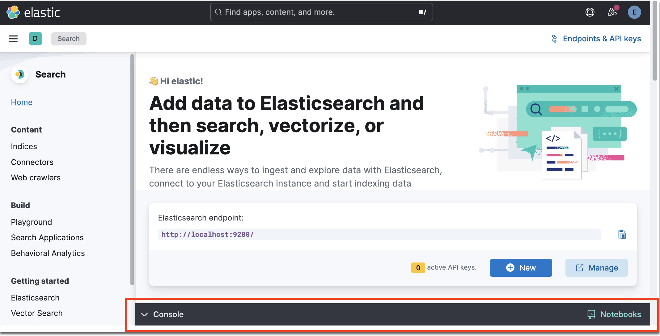 You can also find Console directly on certain Search solution and Elasticsearch serverless project pages, where you can expand it from the footer. This Console, called Persistent Console, has the same capabilities and shares the same history as the Console in Dev Tools.