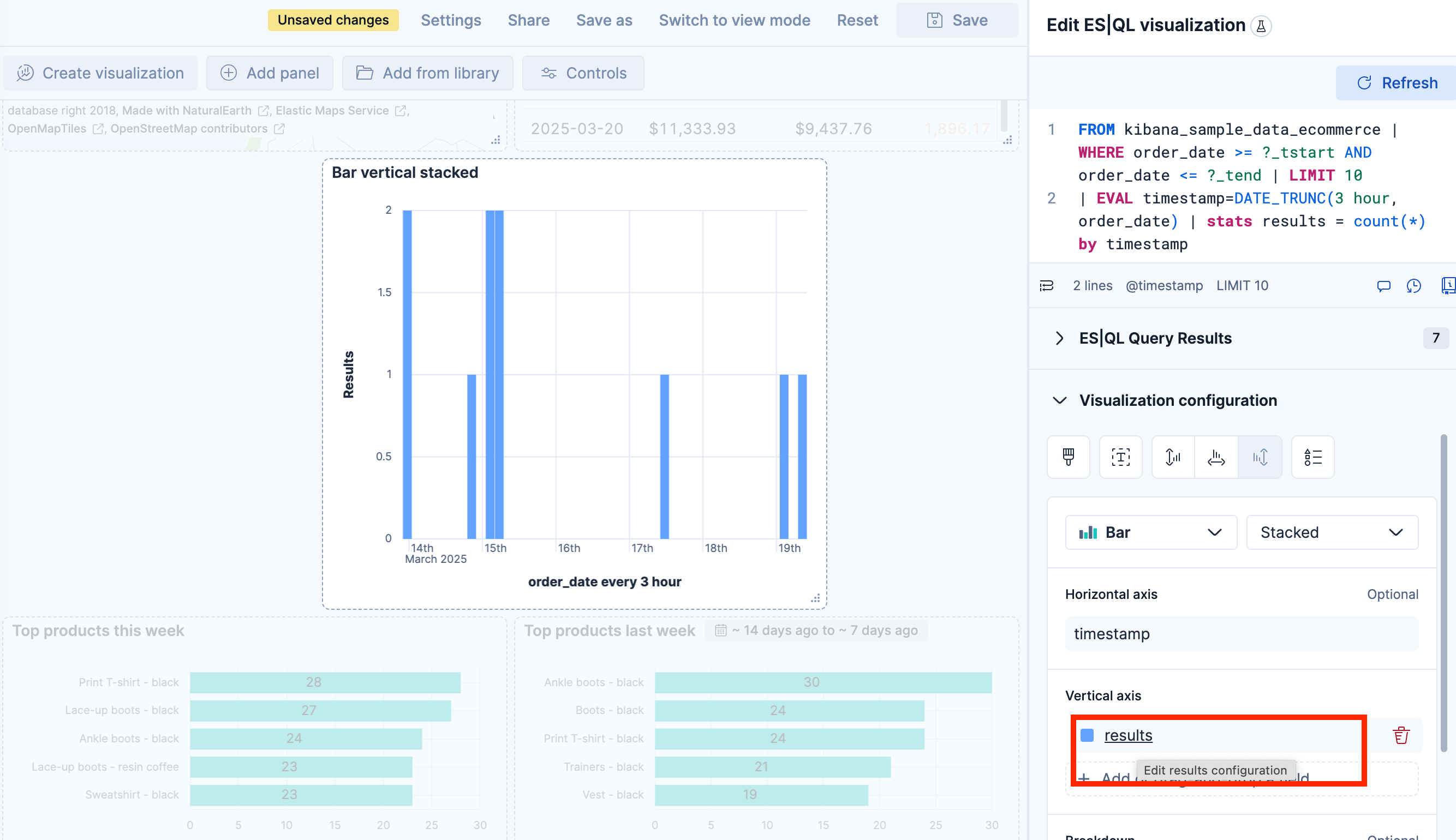NoteWhen you edit the query and run it again, the visualization configuration persists as long as it is compatible with the query changes. Refer to ES|QL visualizations > Chart configuration persistence over ES|QL query update for more details.