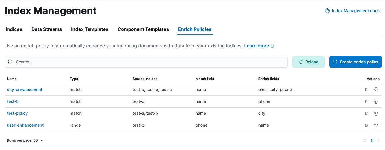 Use the Enrich Policies view to add data from your existing indices to incoming documents during ingest. An enrich policy contains: