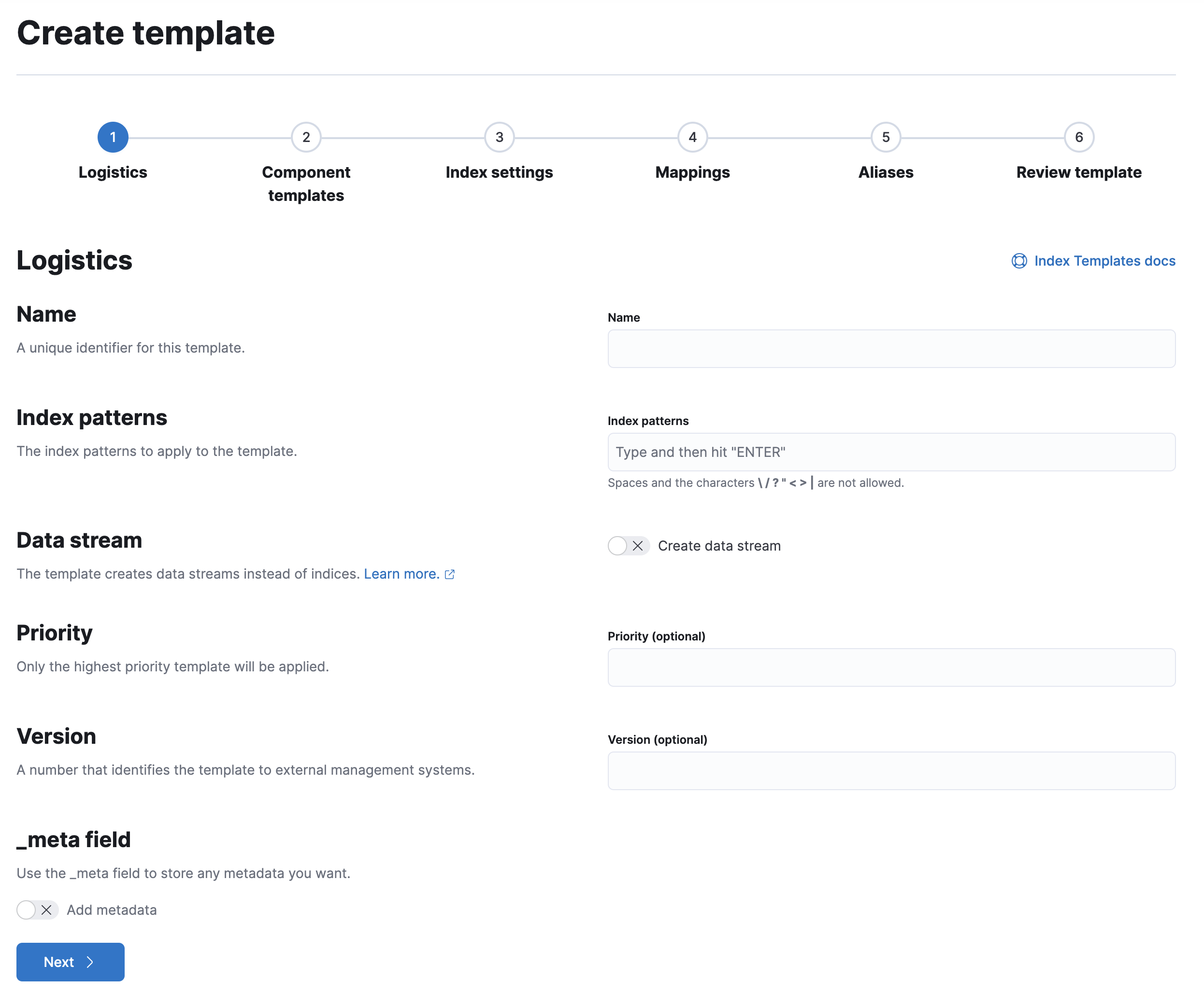 my-index-*so the template matches any index with that index pattern.Leave Data Stream, Priority, Version, and _meta field blank or as-is.