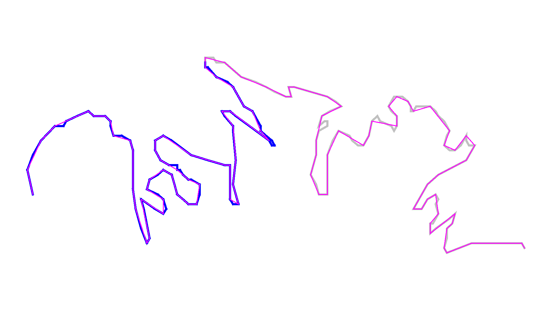 For comparison we have shown the original in grey, the truncated in blue and the new simplified geometry in magenta. It is possible to see where the new simplified line deviates from the original, but the overall geometry appears almost identical and is still clearly recognizable as the north shore of Kodiak Island.