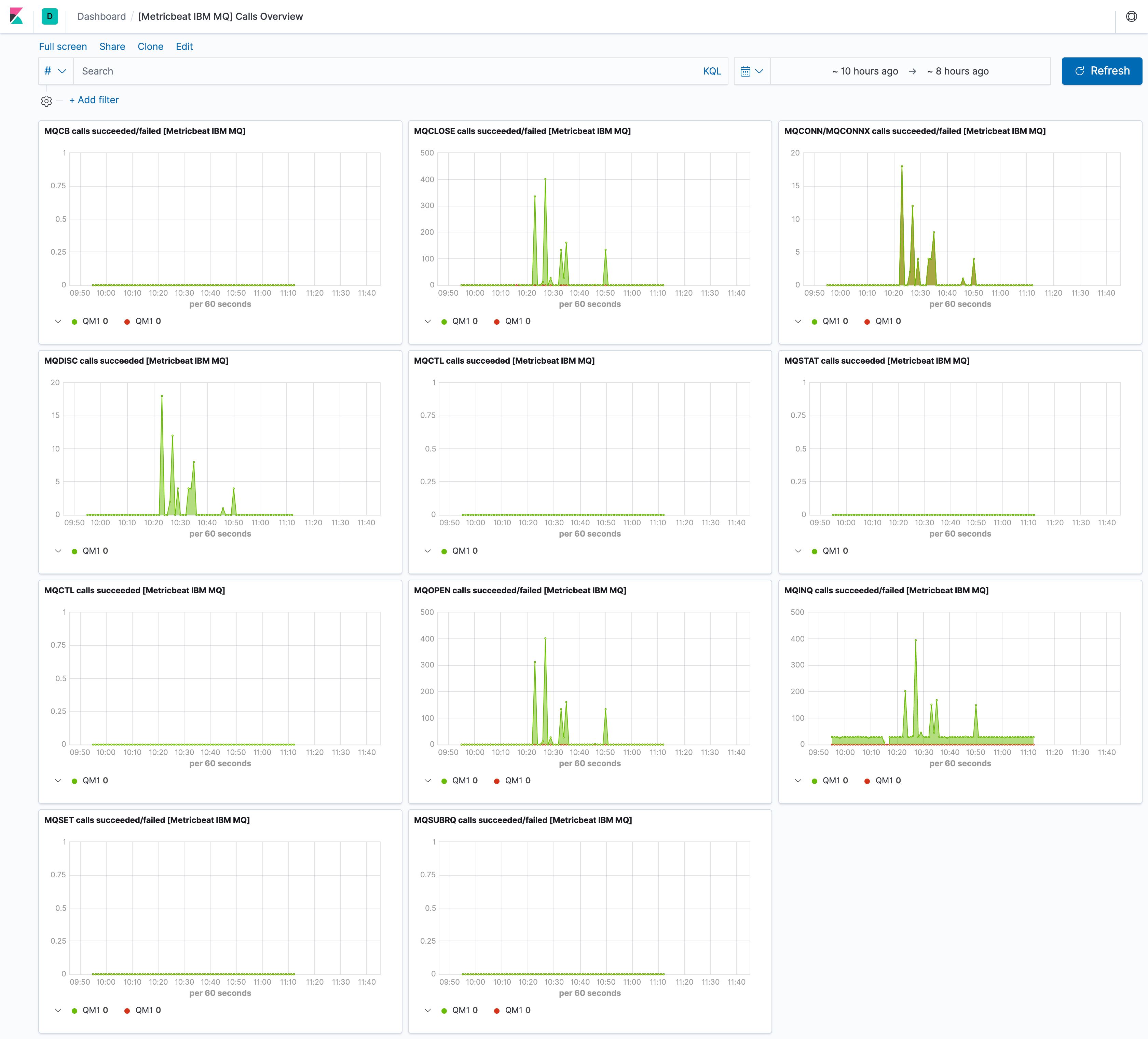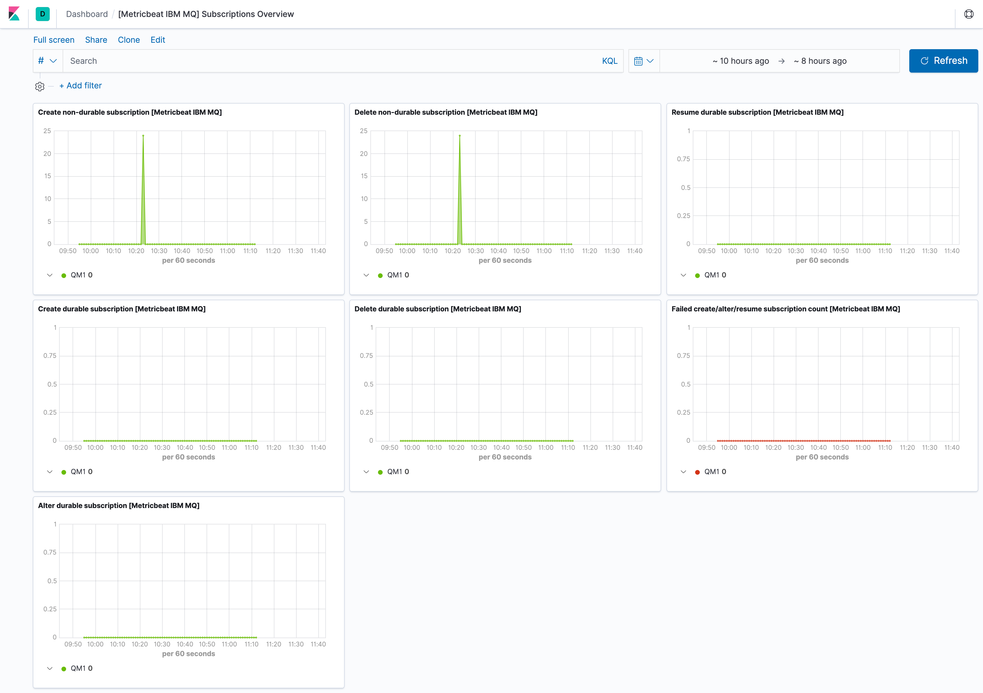 The ibmmq module includes predefined dashboards with overview information of the monitored Queue Manager, including subscriptions, calls and messages.