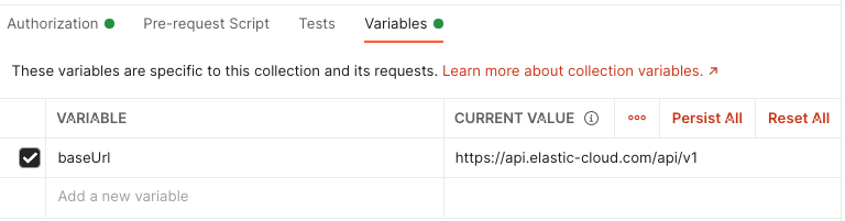 Collectionstab, hover over the Elastic Cloud API collection, and select View more actions → Edit.Under the Variables tab: