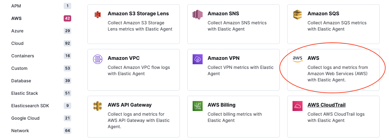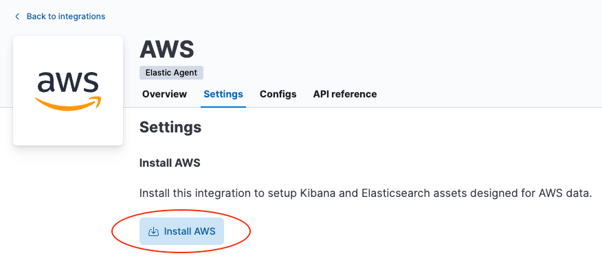 - Then install the AWS integration assets. This integration provides assets such as index templates, ingest pipelines, and dashboards that will serve as the destination points for the data routed by the Firehose Integration. Find the AWS integration by searching or browsing the catalog.
