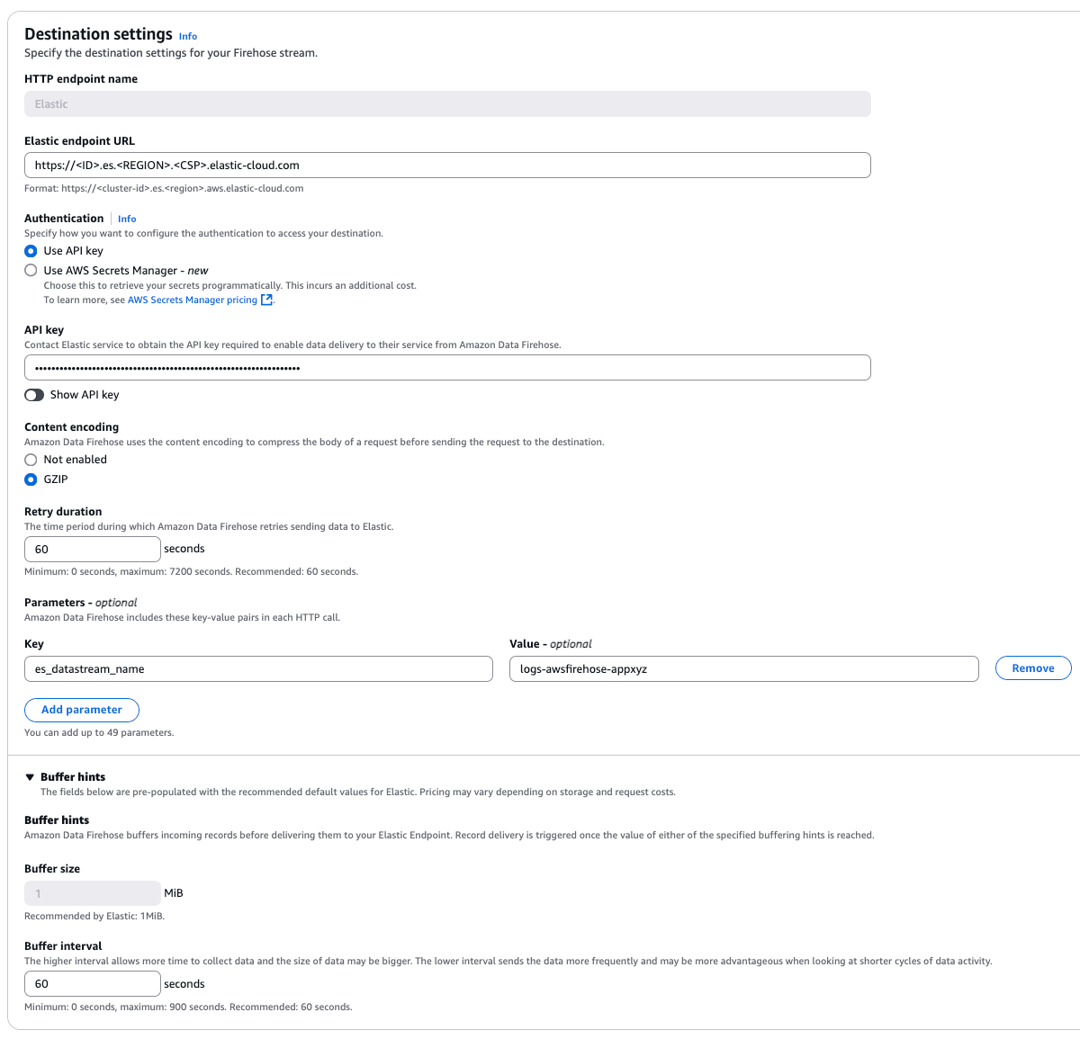 es_datastream_name: Accepts a data stream name of your choice. You can configure this when you ingest data formats that are not officially supported and managed through your customized data streams. Also, you may use this to separate your ingested data from default indexes. By default, logs will be stored in indexes oflogs-awsfirehose-default(index templatelogs-awsfirehose) data stream and metrics will be stored in indexes ofmetrics-aws.cloudwatch-default(index templatemetrics-aws.cloudwatch) data stream. When configuring, please make sure configured API key has required permissions to ingest data into the configured data stream.include_cw_extracted_fields: Optional parameter that can be set when using a CloudWatch logs subscription filter as the Firehose data source. When set to true, extracted fields generated by the filter pattern in the subscription filter will be collected. Setting this parameter can add many fields into each record and may significantly increase data volume in Elasticsearch. As such, use of this parameter should be carefully considered and used only when the extracted fields are required for specific filtering and/or aggregation.