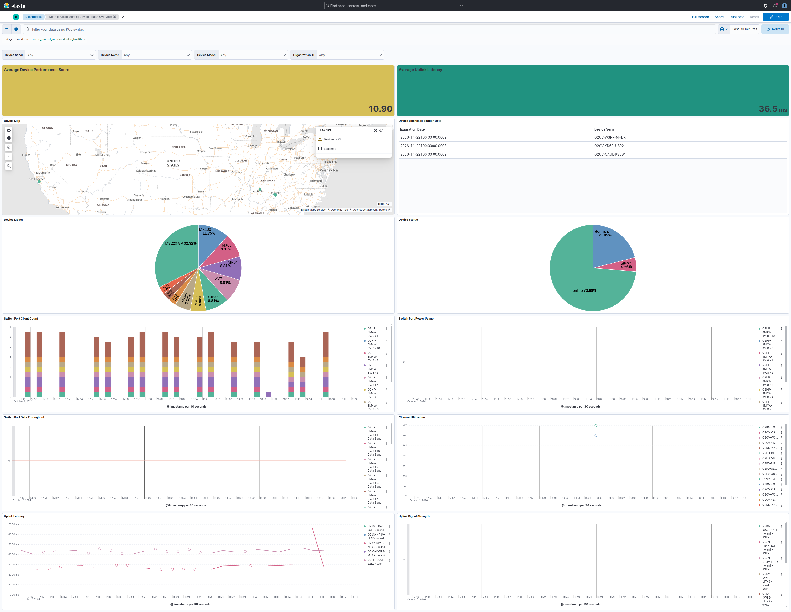The device_health dataset provides metrics related to the health and status of Meraki devices. All Cisco Meraki specific fields are available in the meraki field group.