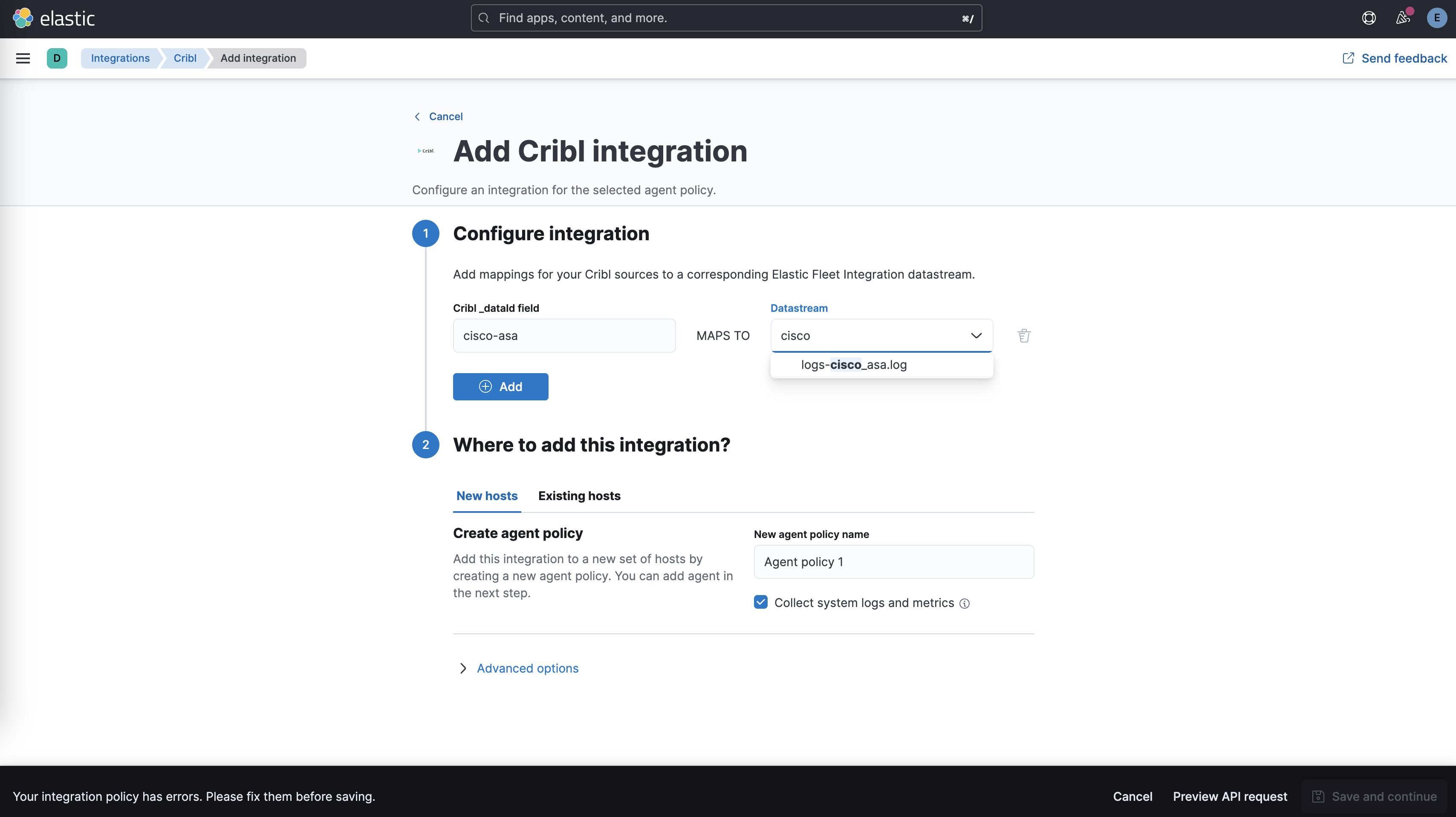 NoteThe Cribl integration does not require Elastic Agent, but a policy must be configured when setting up the Cribl integration.