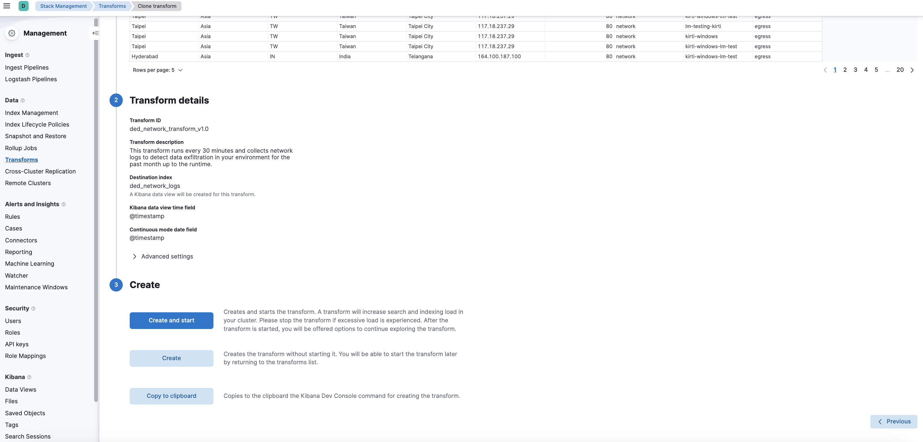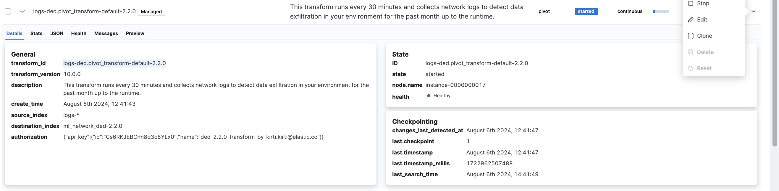 ml_network_ded-<VERSION>. To check the health of the transform go to Management > Stack Management > Data > Transforms underlogs-ded.pivot_transform-default-<FLEET-TRANSFORM-VERSION>. Follow the instructions under the headerCustomize Data Exfiltration Detection Transformbelow to adjust filters based on your environment's needs.Create data views for anomaly detection jobs: This package contains anomaly detection jobs that work on network events (e.g.