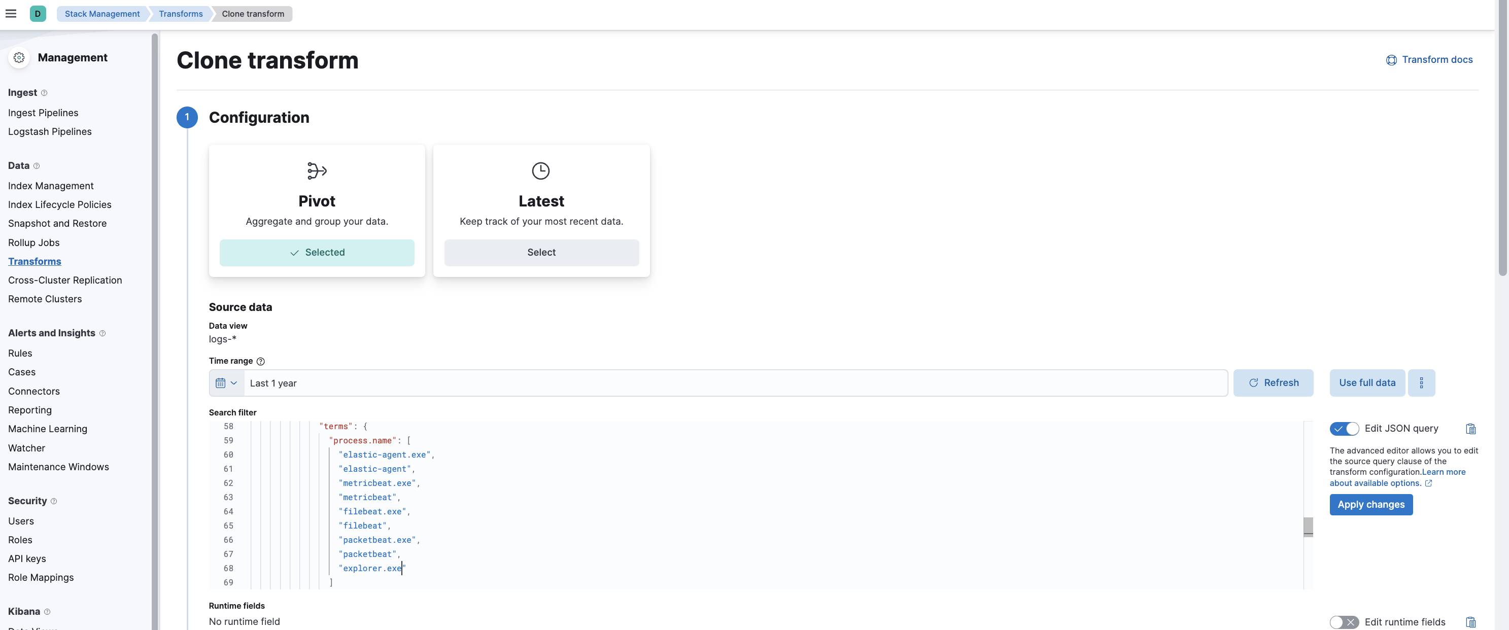 logs-ded.pivot_transform-default-<FLEET-TRANSFORM-VERSION>. - Click on the Actions bar at the far right of the transform and select the Clone option.