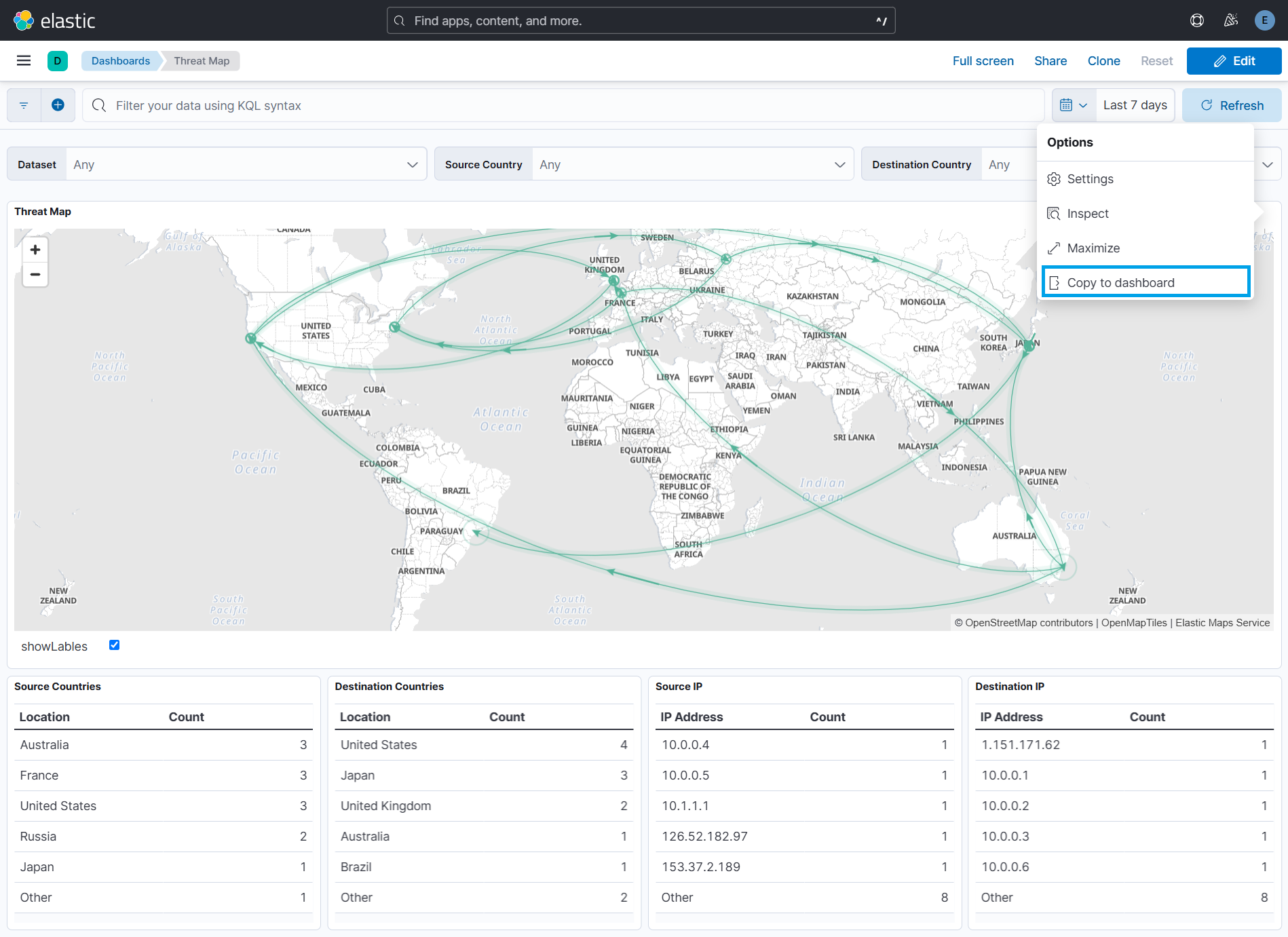 The Threat Map visualization can be added to other dashboards in two ways: