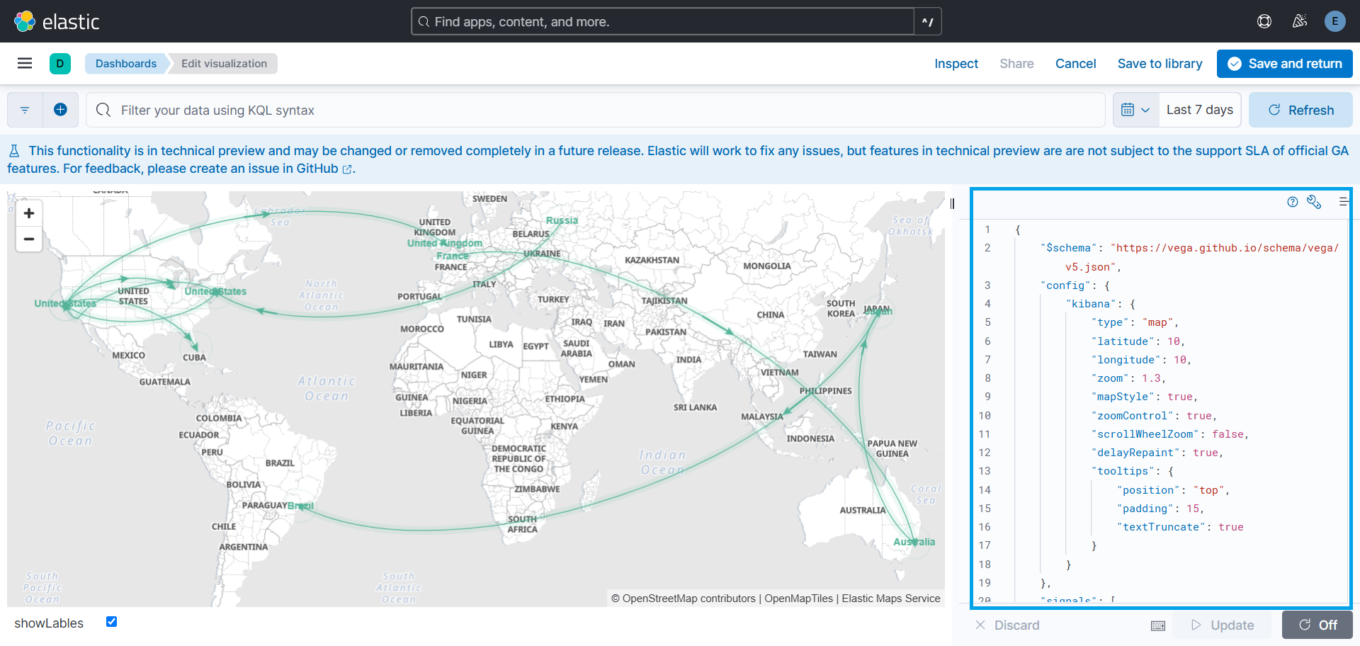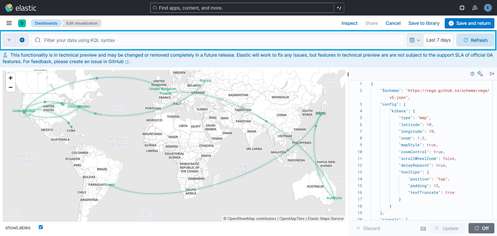 source.geo.location,destination.geo.location,color,animate,weight,source_label, anddestination_label. - Customization: