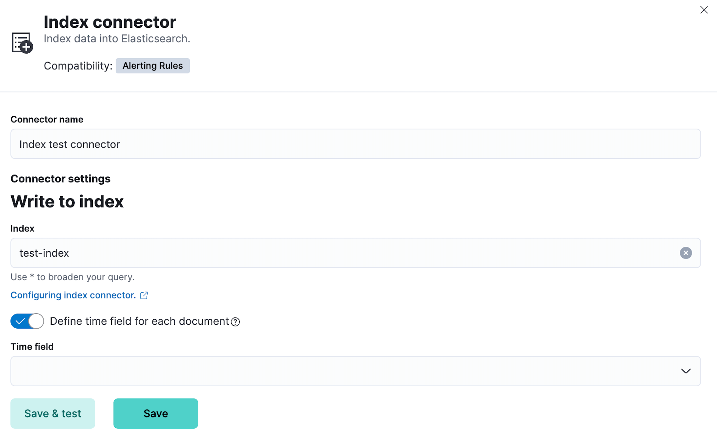 Index connectors must have a name and an Elasticsearch index. You can optionally choose a field that indicates when the document was indexed.