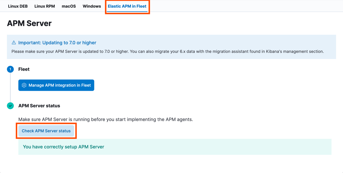 - In the tab "Elastic APM in Fleet" find "Check APM Server status" button and click it. You should see a confirmation that APM Server is working.
