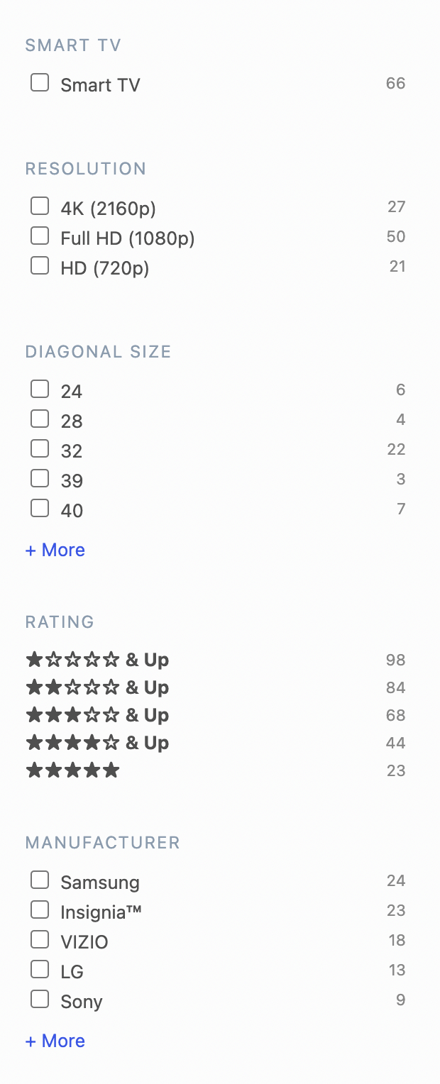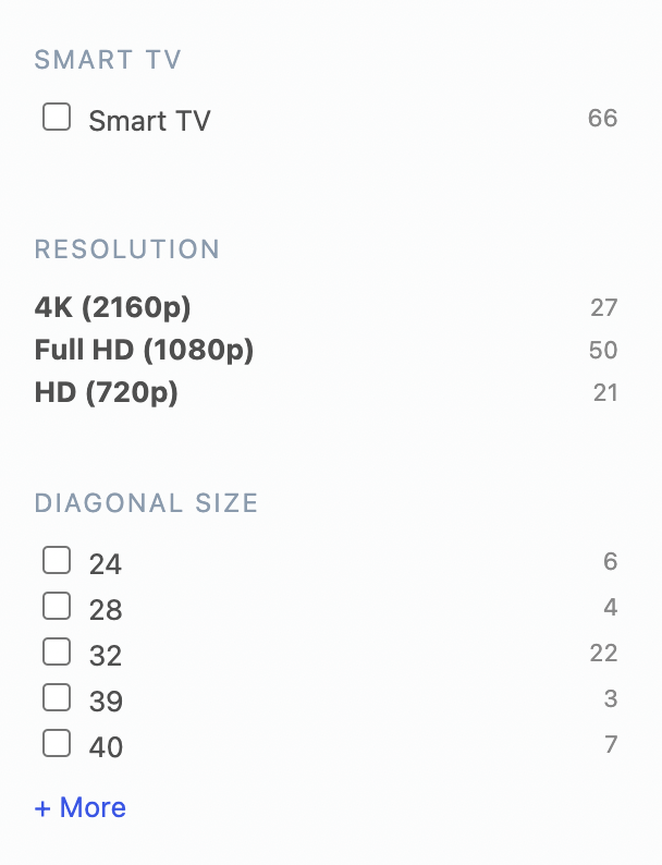 In our example of the TVs category page, in addition to common facets, like:
