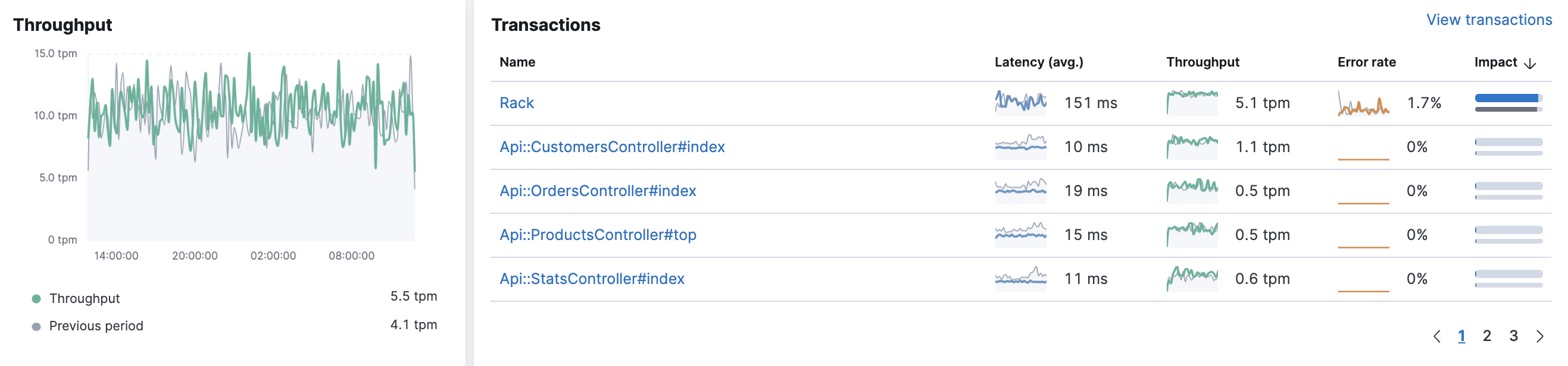 By default, transaction groups are sorted by Impact to show the most used and slowest endpoints in your service. If there is a particular endpoint you are interested in, click View transactions to view a list of similar transactions on the transactions overview page.