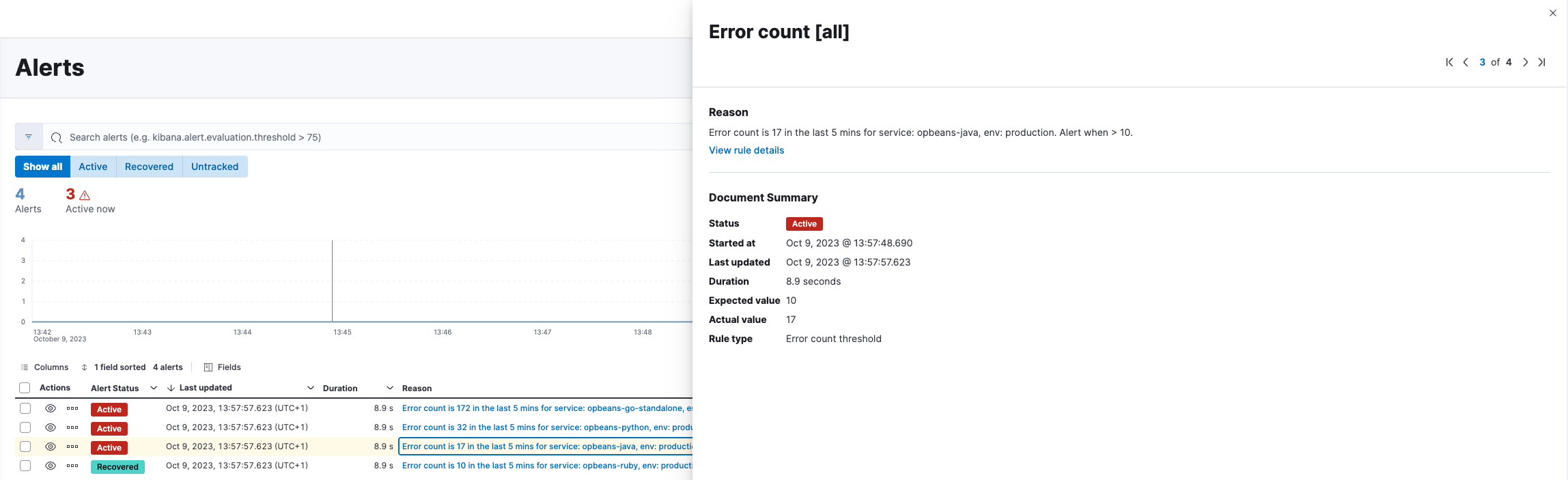 From the Alerts table, you can click on a specific alert to open the alert detail flyout to view a summary of the alert without leaving the page. There you’ll see the current status of the alert, its duration, and when it was last updated. To help you determine what caused the alert, you can view the expected and actual threshold values, and the rule that produced the alert.