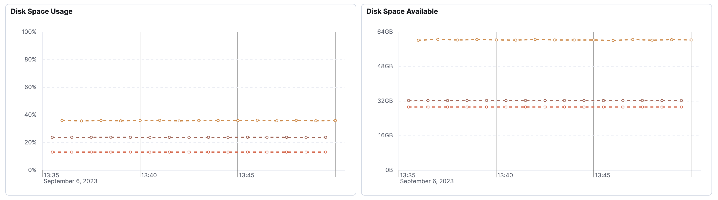 On the Metrics tab, view metrics trending over time, including CPU usage, normalized load, memory usage, disk usage, and other metrics related to disk IOPs and throughput. Place your cursor over a line to view metrics at a specific point in time. From within each visualization, you can choose to open the visualization in Lens.