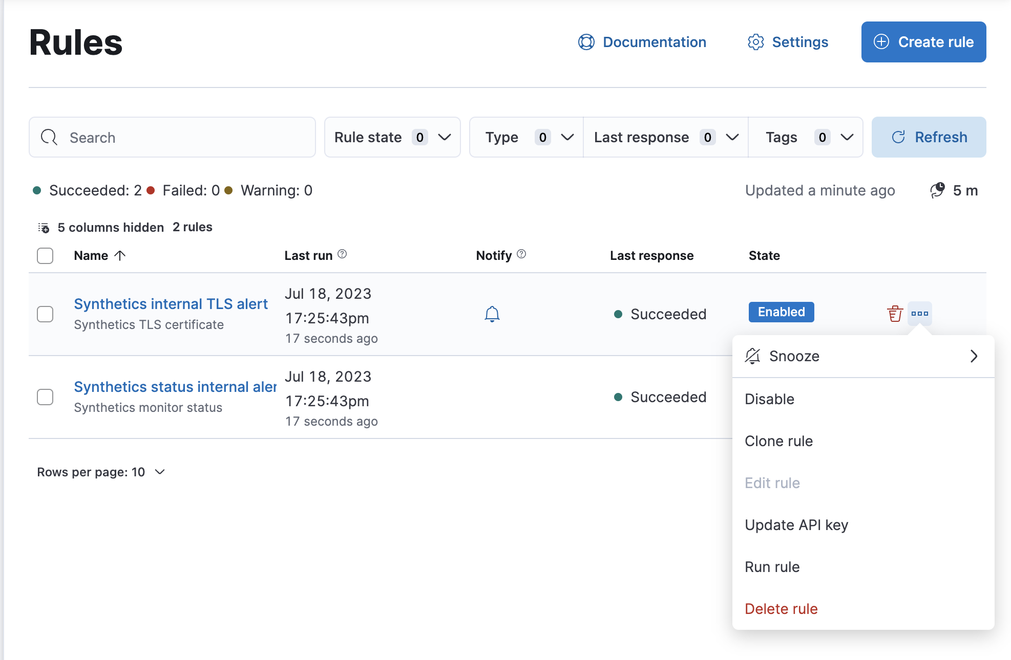 On the Rules page, you can manage the default synthetics rules including snoozing rules, disabling rules, deleting rules, and more.