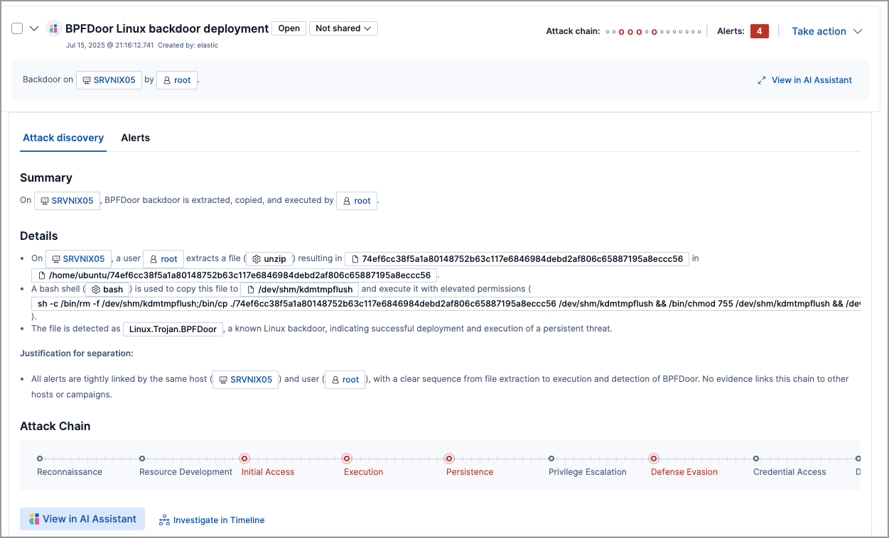 - Click View in AI Assistant or Add to chat to attach the discovery to a conversation. You can then ask follow-up questions about the discovery or associated alerts.