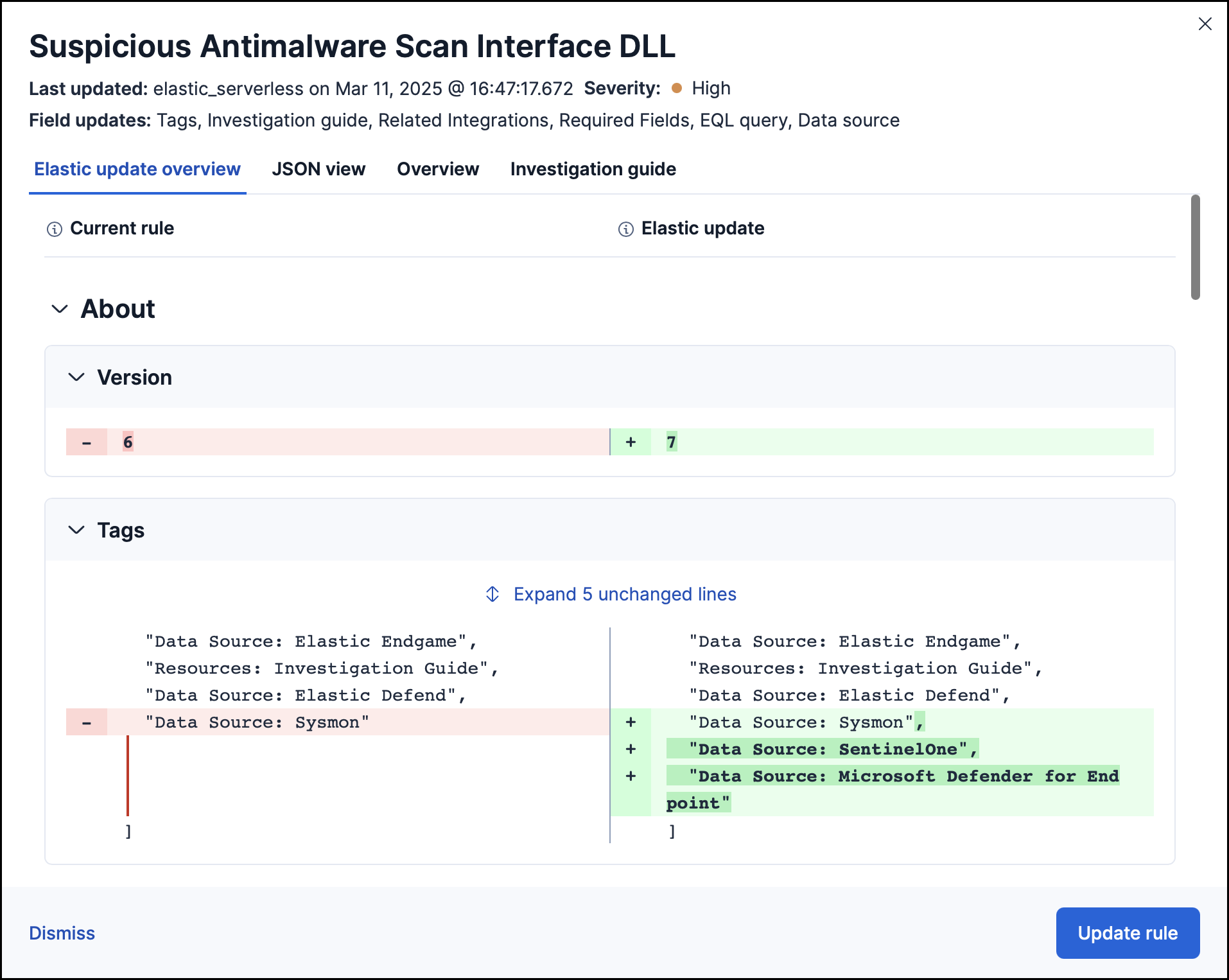 Select the Elastic update overview tab to view rule changes field by field, or the JSON view tab to view changes for the entire rule in JSON format. Both tabs display side-by-side comparisons of the Current rule (what you currently have installed) and the Elastic update version (what you can choose to install). Deleted characters are highlighted in red; added characters are highlighted in green.