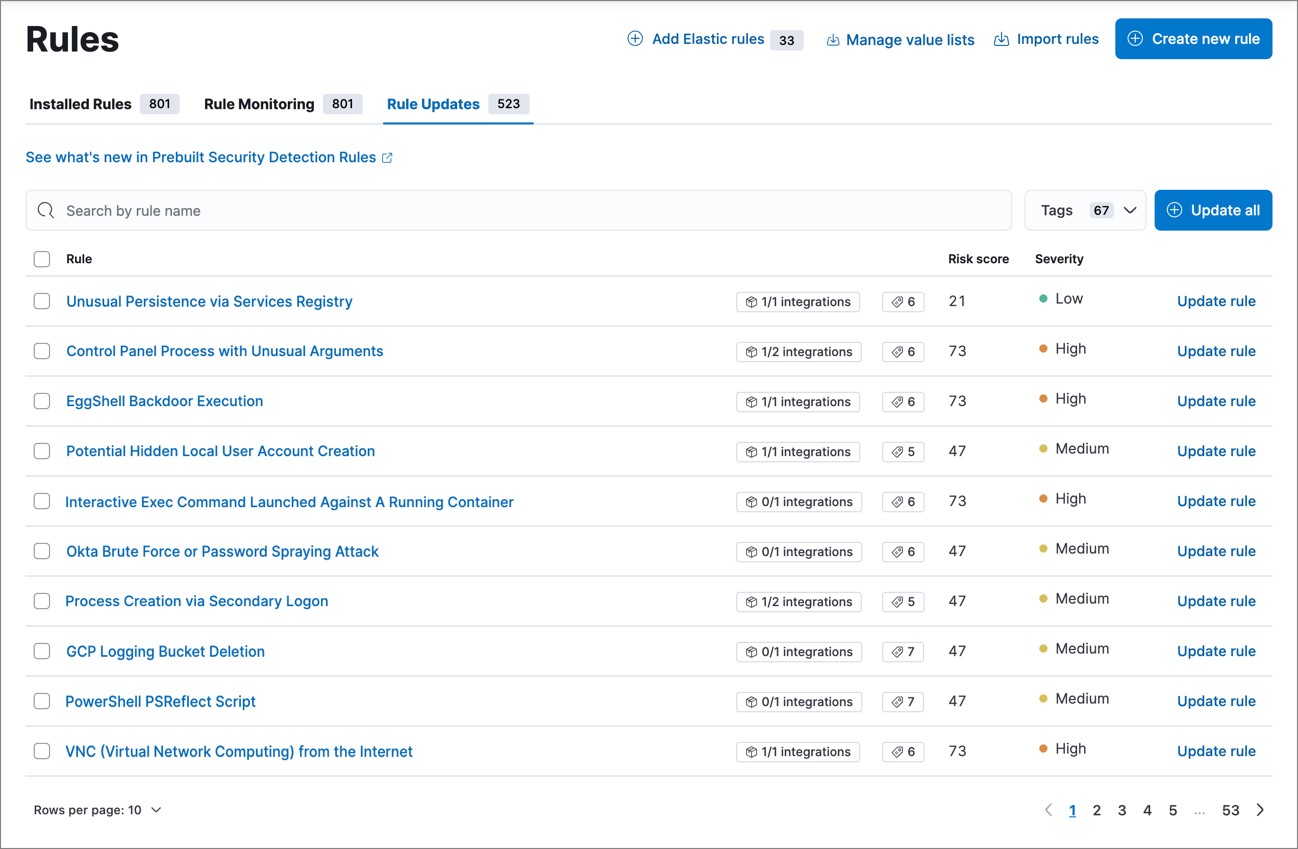 Elastic regularly updates prebuilt rules to optimize their performance and ensure they detect the latest threats and techniques. When updated versions are available for your installed prebuilt rules, the Rule Updates tab appears on the Rules page, allowing you to update your installed rules with the latest versions.