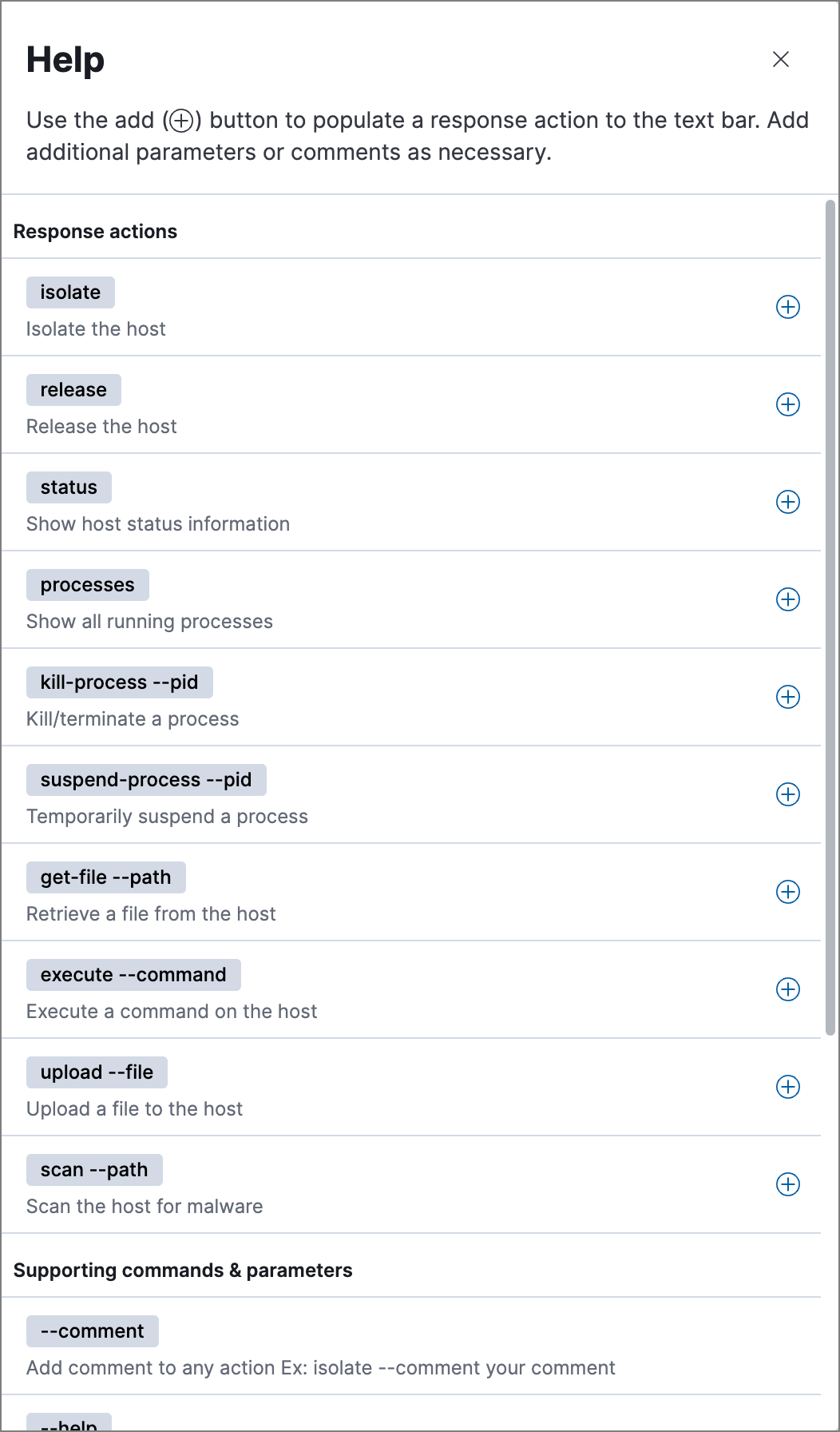 Example: isolate --comment "Isolate host related to detection alerts"