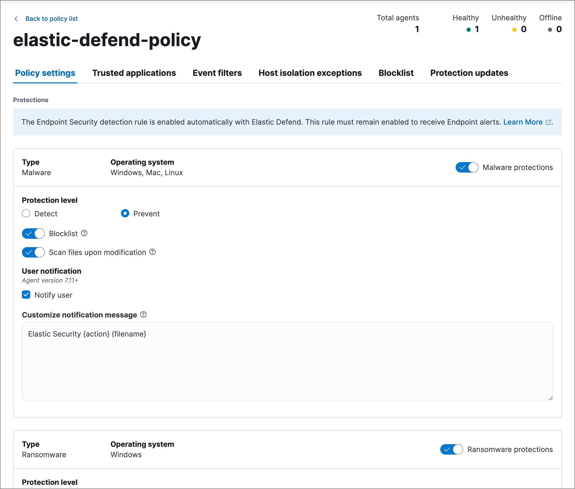 If you need help troubleshooting a configuration failure, refer to Troubleshoot Elastic Defend and Common problems with Fleet and Elastic Agent.
