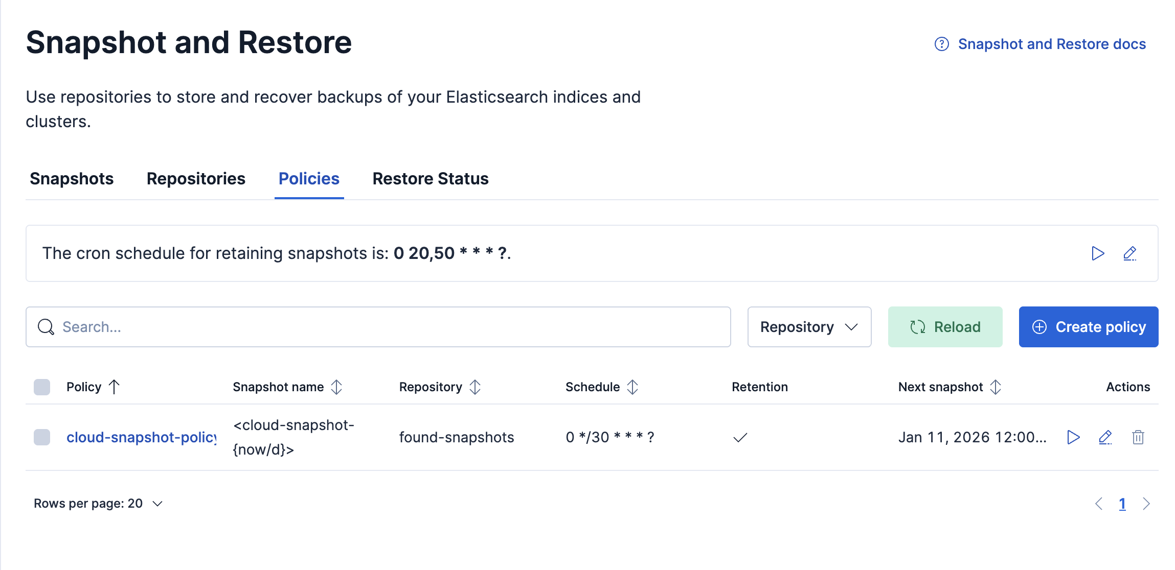 1. Go to Snapshot and Restore > Policies to see the list of configured policies. You can find the Snapshot and Restore management page using the navigation menu or the global search field.