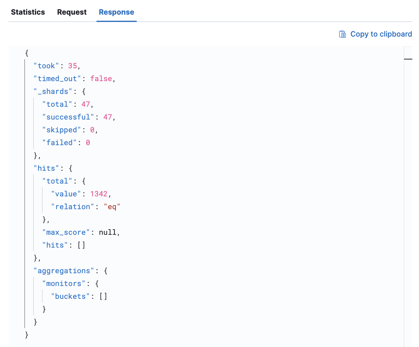 The Request tab shows the exact syntax used in the request. You can click Copy to clipboard to copy the request or Open in Console to open it in the Kibana console.